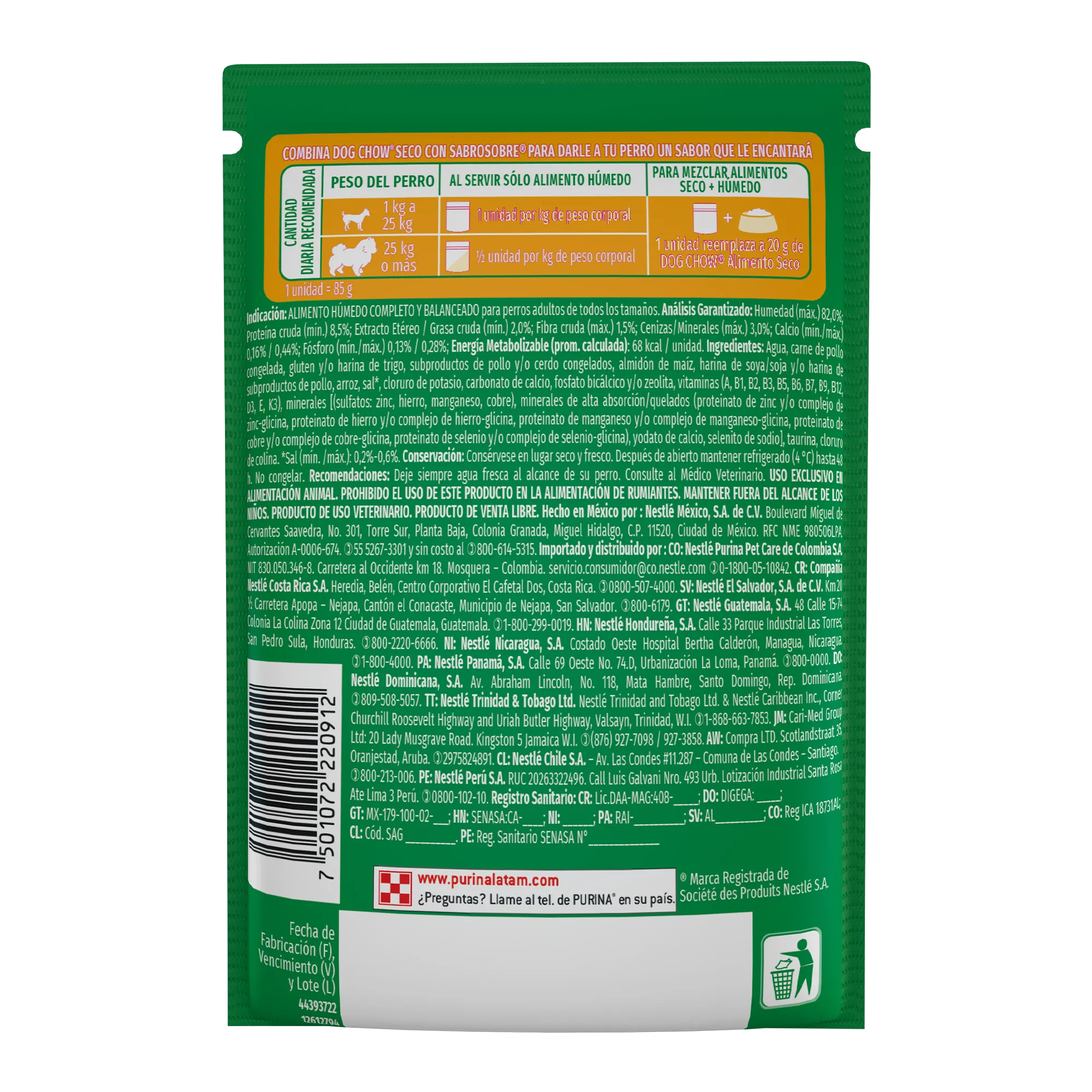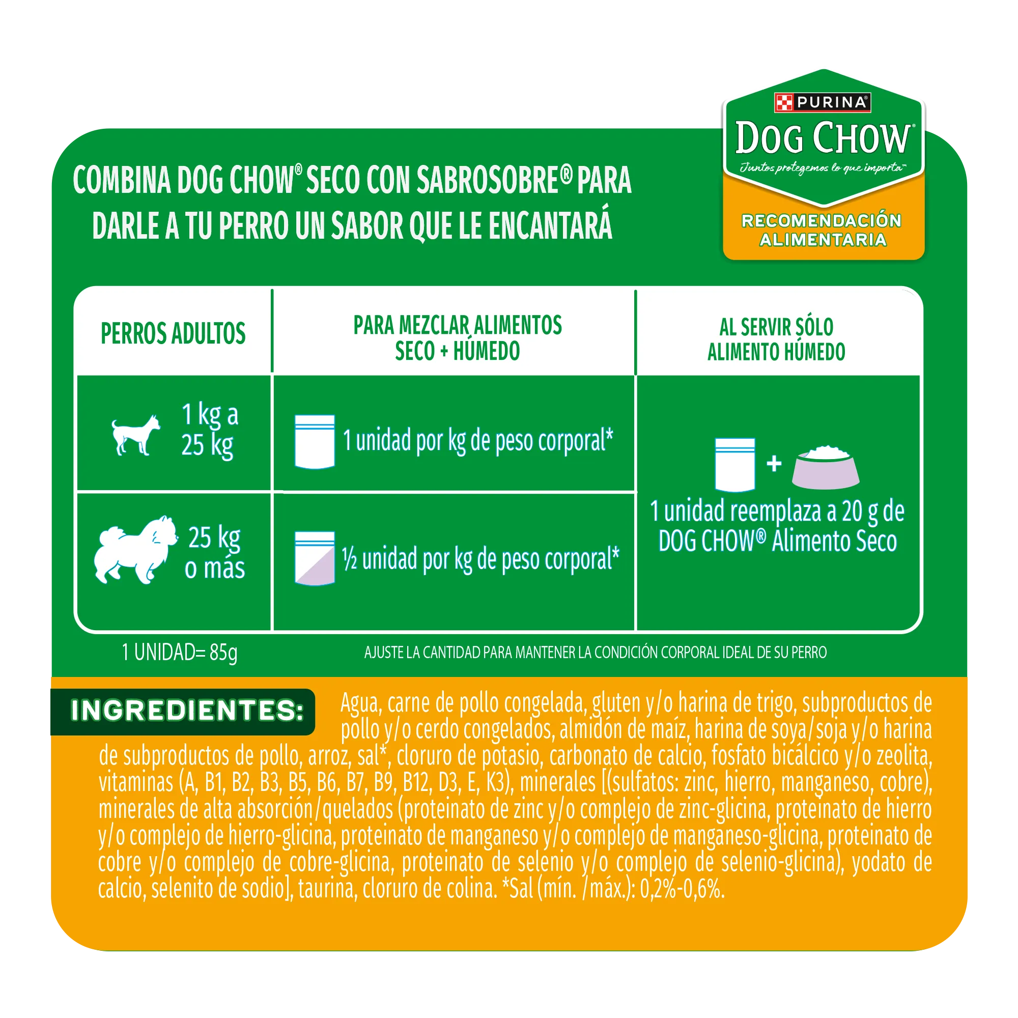 Sabrosobre® Purina Dog Chow® Nutrición Reforzada+ Pollo es un alimento húmedo 100% completo y balanceado, diseñado específicamente para perros Adultos de todos los tamaños. Elaborado con ingredientes de alta calidad como pollo y arroz. Esta receta ofrece una nutrición sabrosa en forma de filetes con arroz.