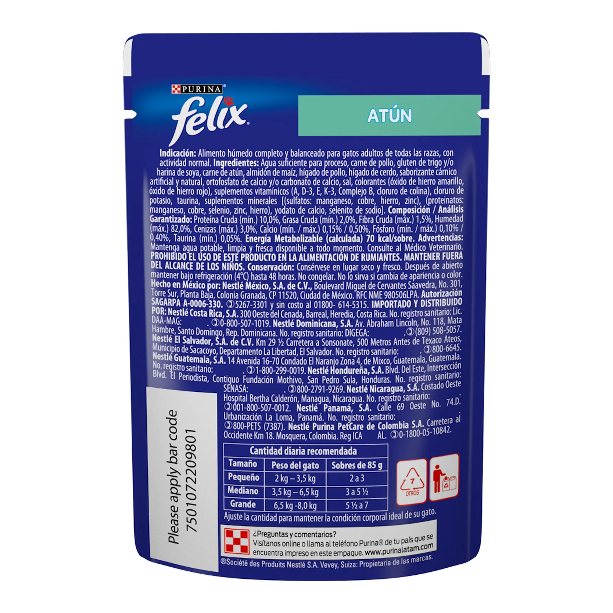 Agua suficiente para proceso, carne de pollo, gluten de trigo y/o harina de soya, carne de atún, almidón de maíz, hígado de pollo, hígado de cerdo, saborizante cárnico artificial y natural, ortofosfato de calcio y/o carbonato de calcio, sal, colorantes (óxido de hierro amarillo, óxido de hierro rojo), suplementos vitamínicos (A, D-3, E, K-3, Complejo B, cloruro de colina), cloruro de potasio, taurina, suplementos minerales .