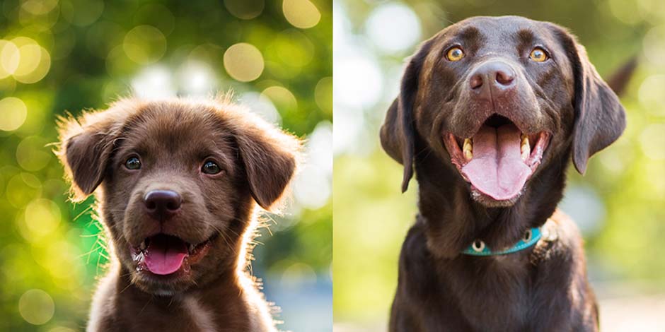 Crecimiento de los perritos bebé. Comparativa de un labrador chocolate cachorro y uno adulto.