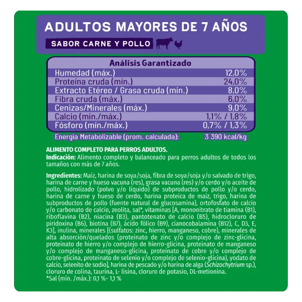 Maíz, harina de soya/soja, fibra de soya/soja y/o salvado de trigo, harina de carne y hueso vacuna (res), grasa vacuna (res) y/o cerdo y/o aceite de pollo, hidrolizado (polvo y/o líquido) de subproductos de pollo y/o cerdo, harina de carne y hueso de cerdo, harina proteica de maíz, trigo, harina de subproductos de pollo (fuente natural de glucosamina), ortofosfato de calcio y/o carbonato de calcio, zeolita, sal*, vitaminas [A, mononitrato de tiamina (B1), riboflavina (B2), niacina (B3), pantotenato de calcio (B5), hidrocloruro de piridoxina (B6), biotina (B7), ácido fólico (B9), cianocobalamina (B12), C, D3, E, K3], inulina, minerales [(sulfatos: zinc, hierro, manganeso, cobre), minerales de alta absorción/quelados (proteinato de zinc y/o complejo de zinc-glicina, proteinato de hierro y/o complejo de hierro-glicina, proteinato de manganeso y/o