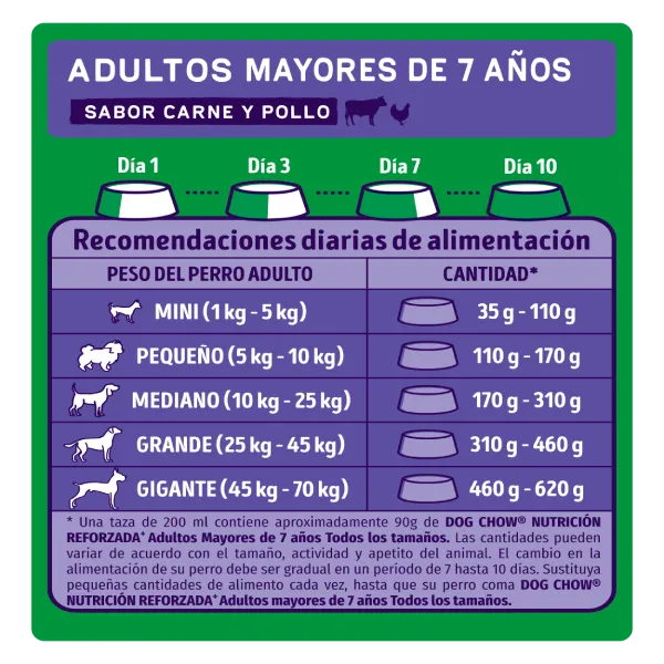 de acuerdo con el tamaño, actividad y apetito del animal. El cambio en la alimentación de su perro debe ser gradual en un período de 7 hasta 10 días. Sustituya pequeñas cantidades de alimento cada vez, hasta que su perro coma DOG CHOW® NUTRICIÓN REFORZADA+ Adultos mayores de 7 años Todos los tamaños.