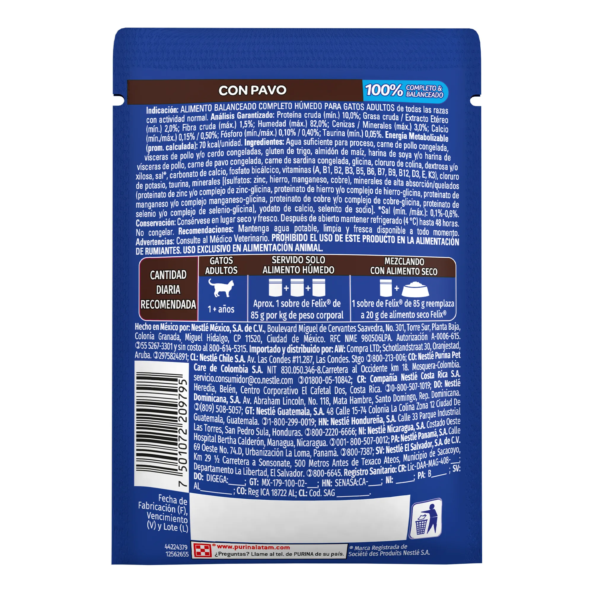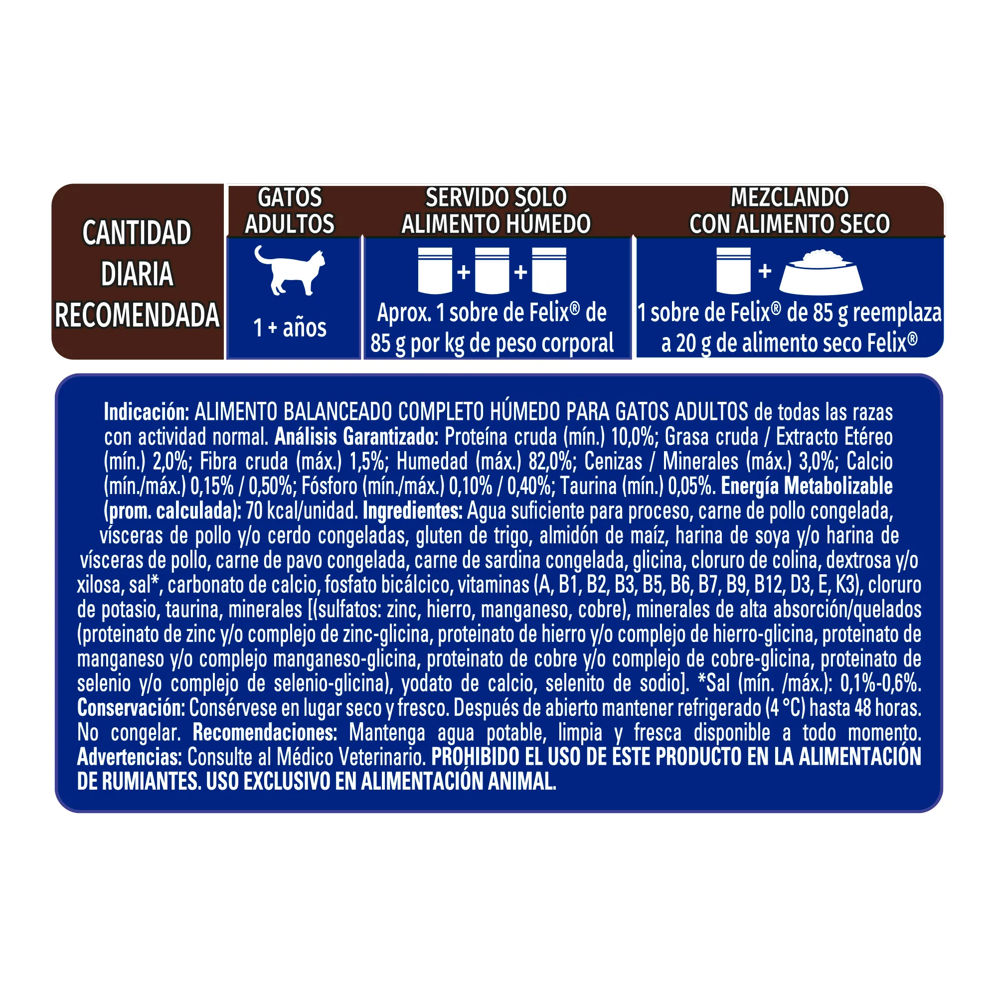 La ración promedio es de 3 sobres de 85 g por cada 4 kg de peso de su gato adulto, repartido en 2 o más comidas. Las necesidades individuales pueden variar y deben ser ajustadas para mantener el peso saludable de su gato